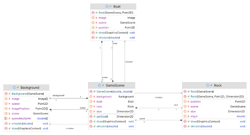 Vytvořte třídu Scene. V konstruktoru se budou vytvářet všechny objekty, minimálně objekty Background, Boat a Rock.